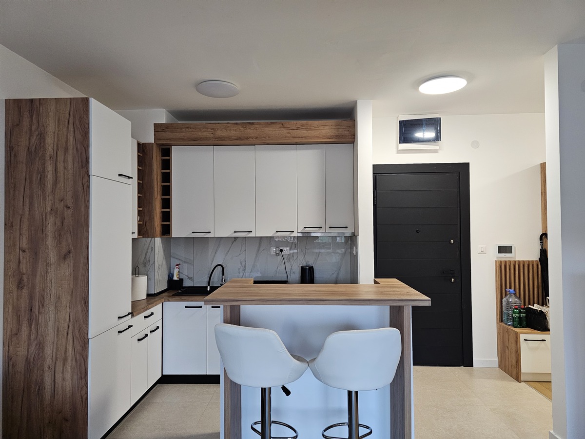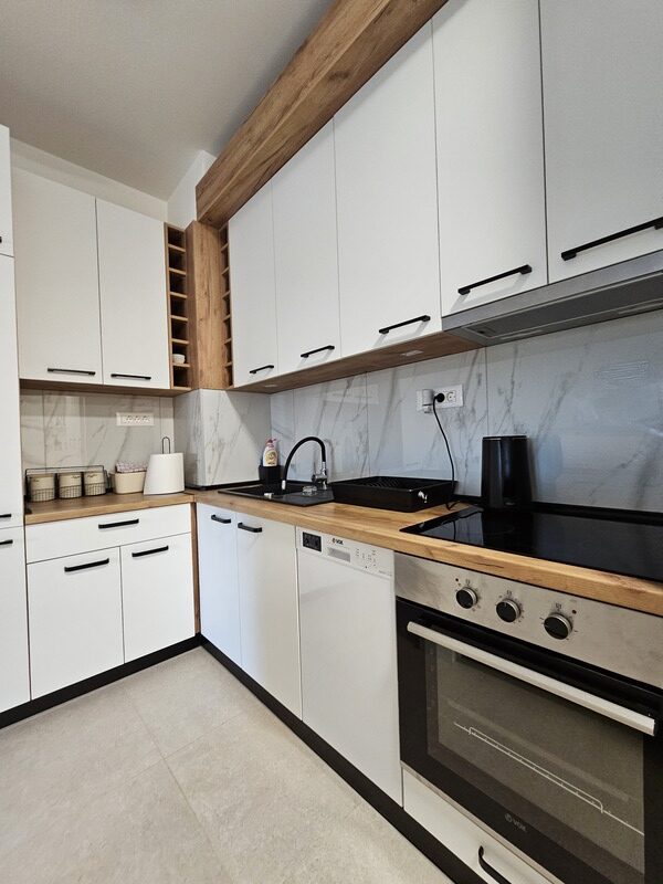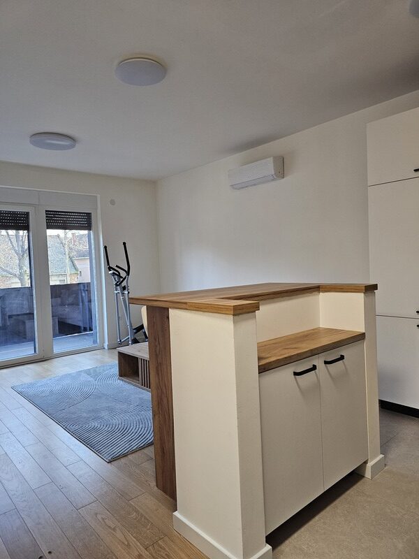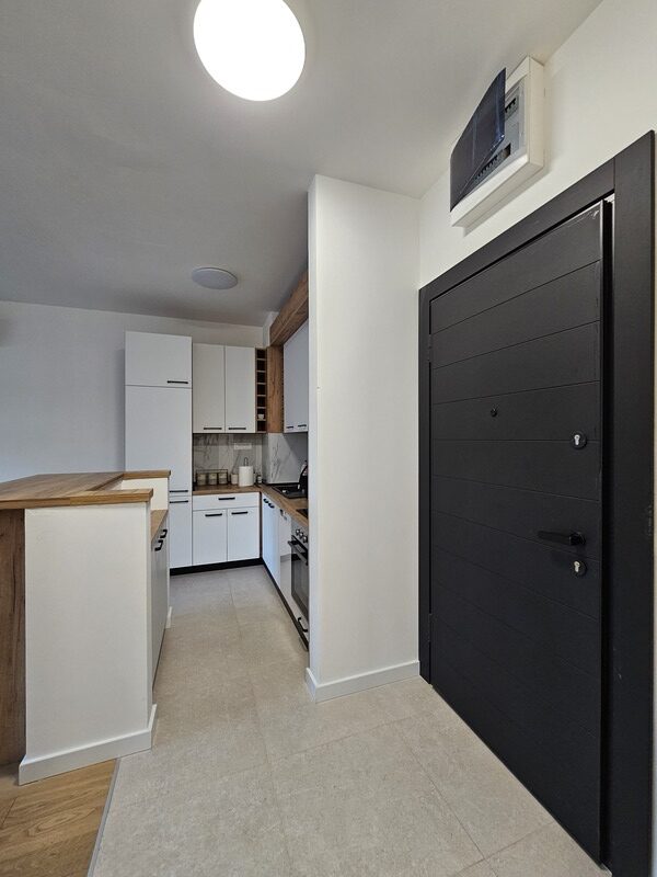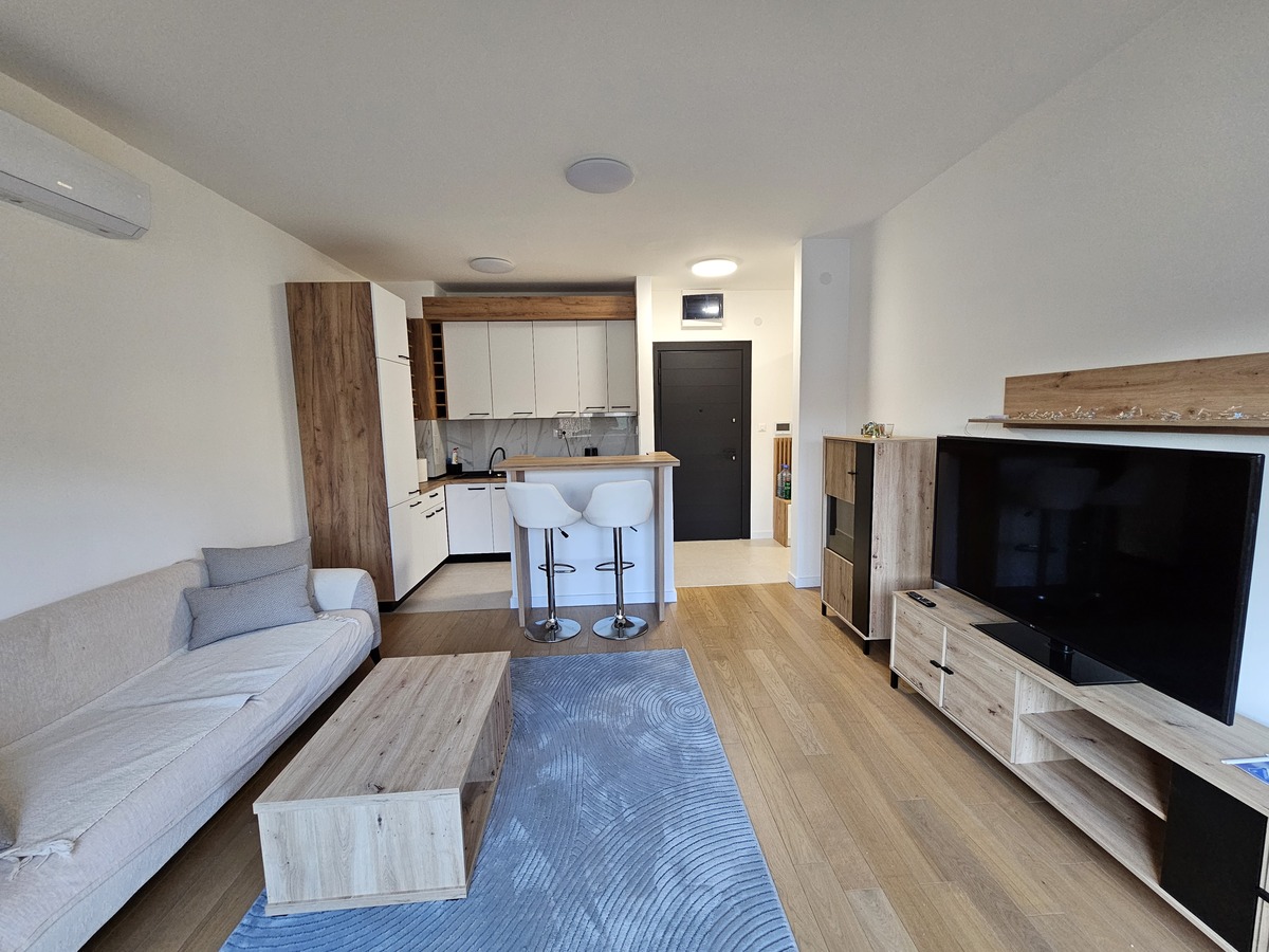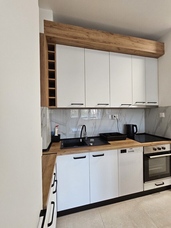 Stan je namešten kao na slikama, kuhinja je opremljena svom tehnikom, TV je u dnevnoj sobi, veš-mešina je u kupatilu.