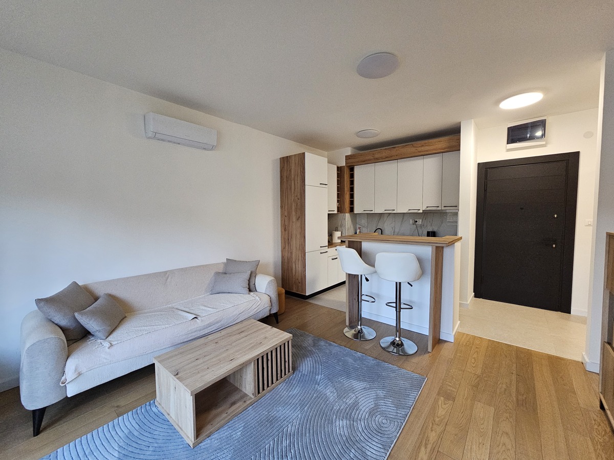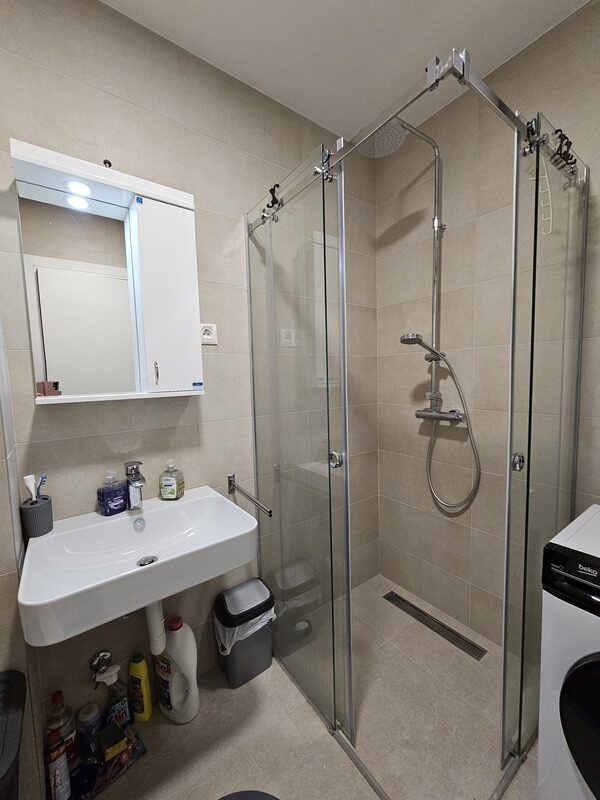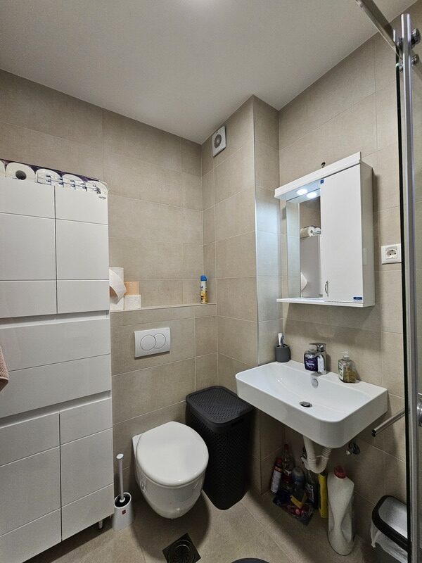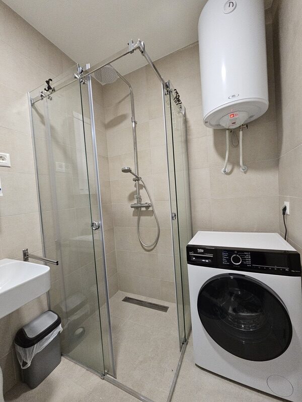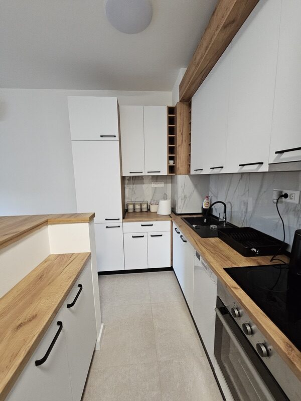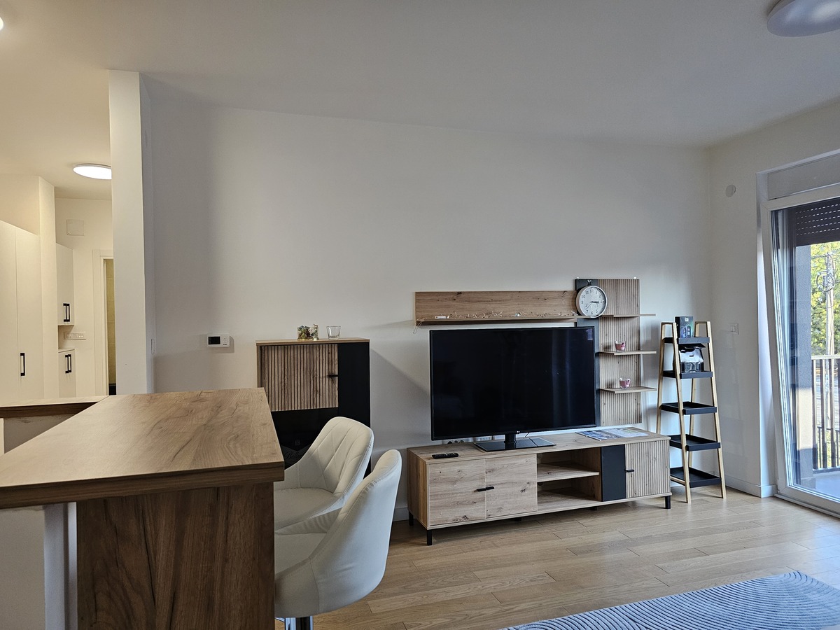 Stan je namešten kao na slikama, kuhinja je opremljena svom tehnikom, TV je u dnevnoj sobi, veš-mešina je u kupatilu.