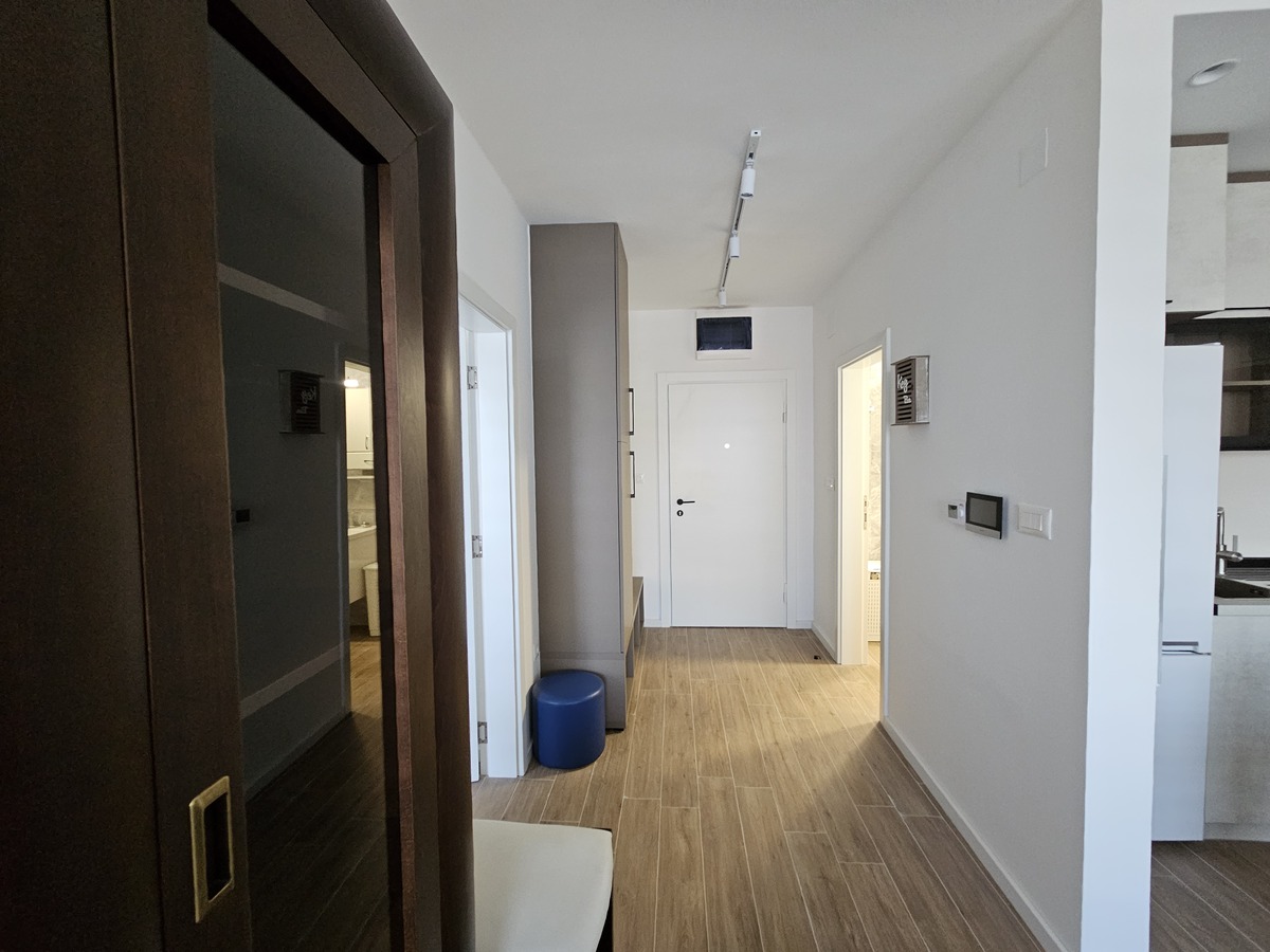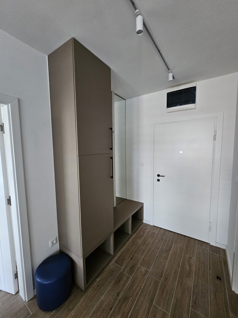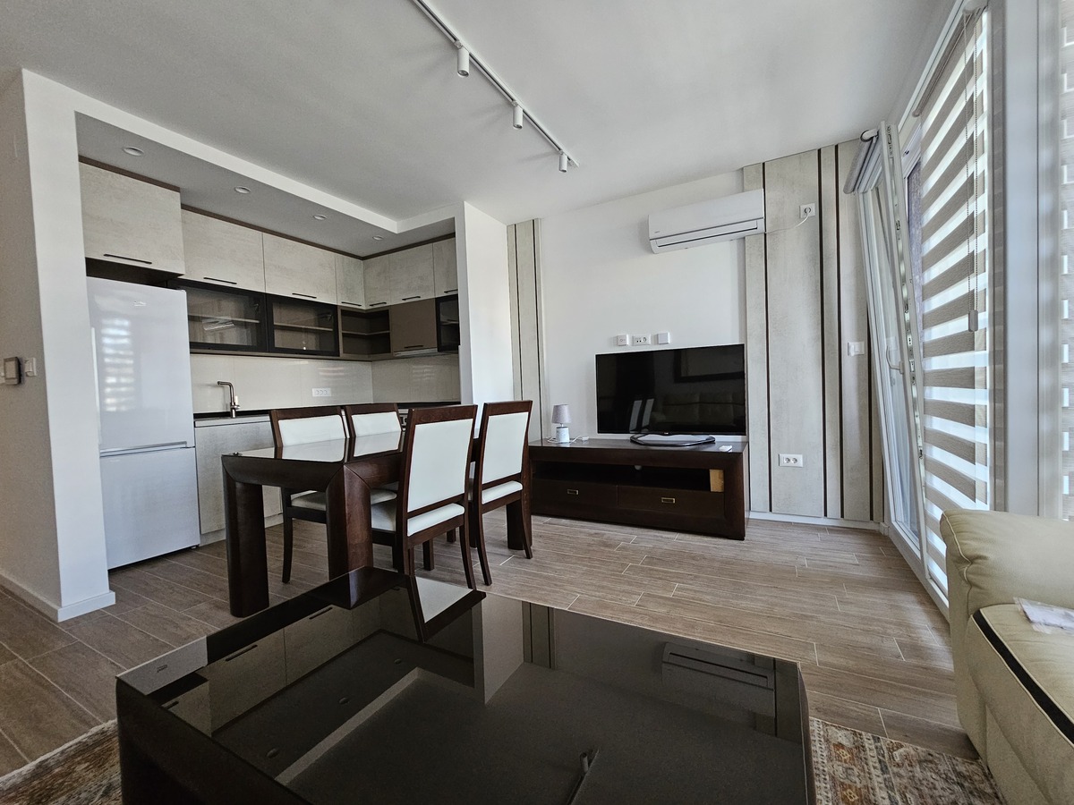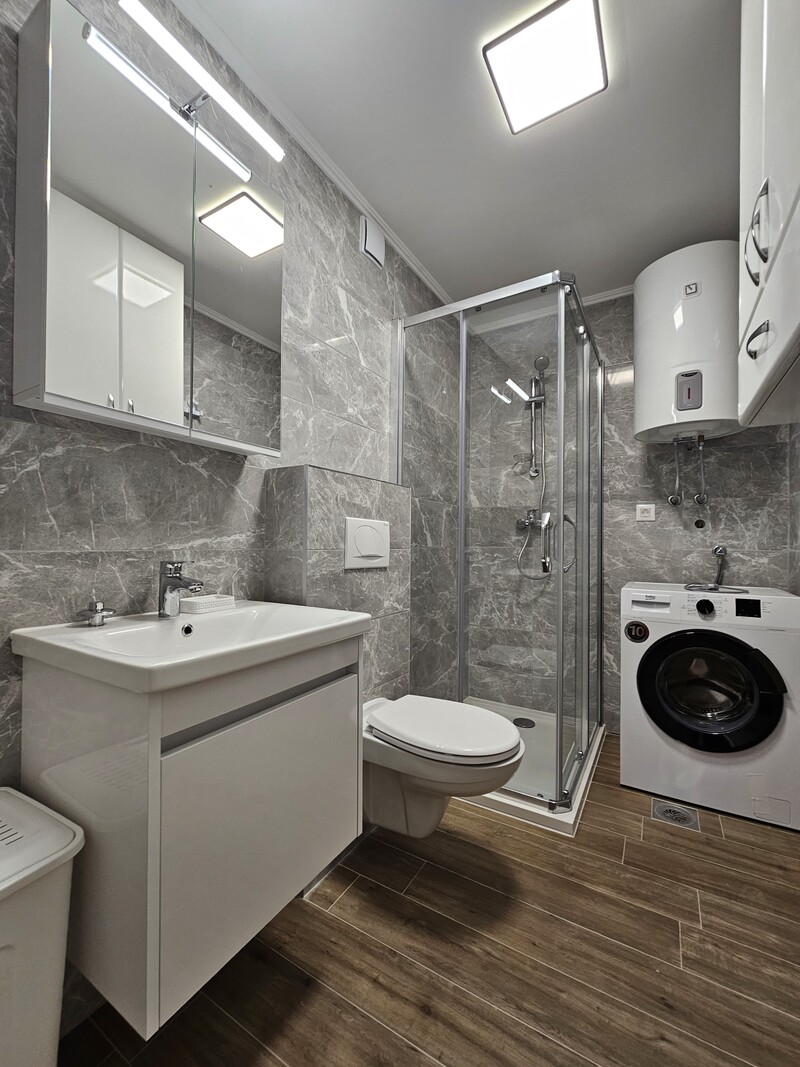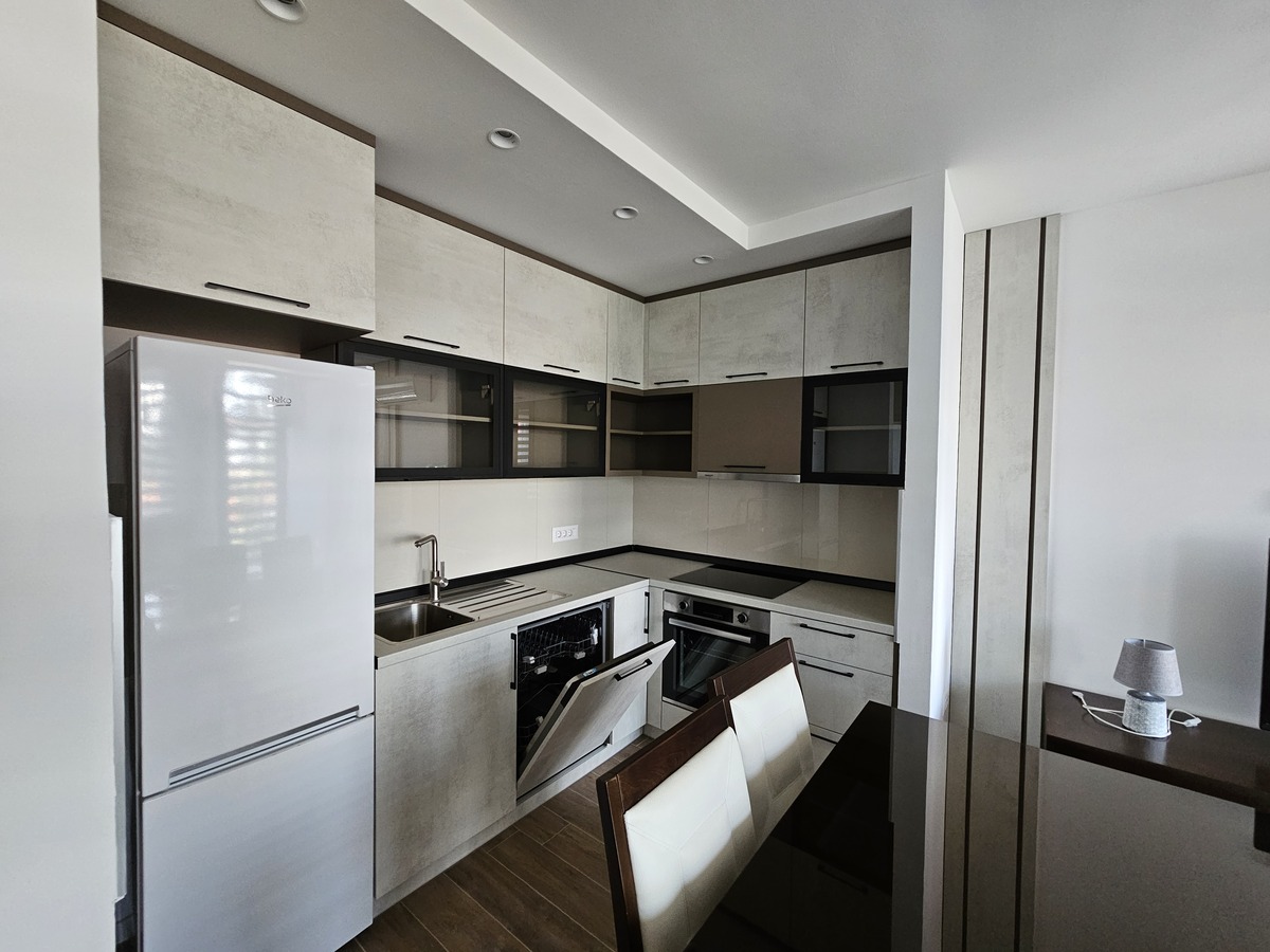 Kuhinja je ugradna sa indukcionom pločom, aspiratorom, rernom, frižiderom sa zamrzivačem, u dnevnoj sobi je TV, u kupatilu mašina za pranje veša.