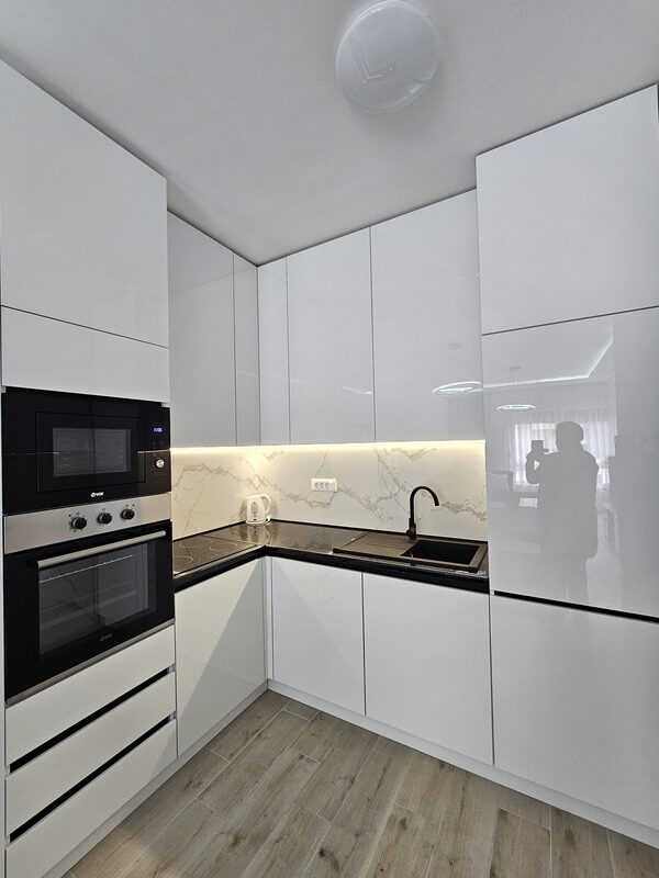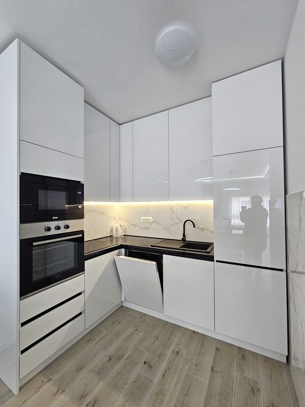 Kuhinja je rađena po meri sa ugradnom tehnikom – staklo-keramička ploča, aspirator, mikrotalasna, rerna, mašina za sudove, frižider sa zamrzivačem.
