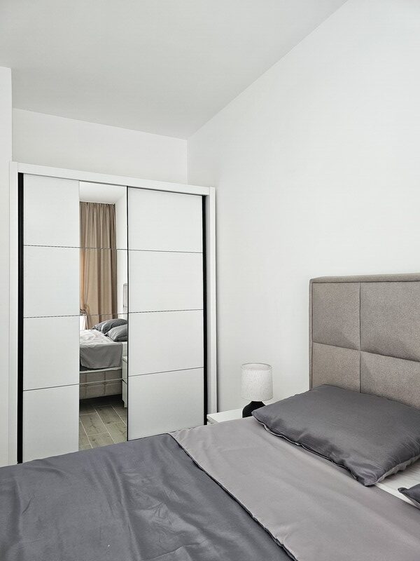 U spavaćoj sobi je bračni krevet (ima sanduk), plakar i TV.