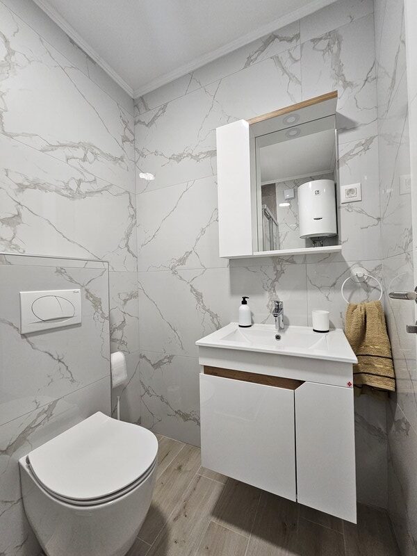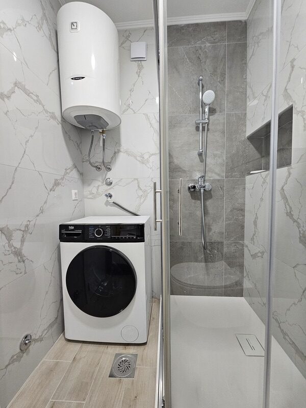 Kupatilo je sa tuš kabinom i mašinom za sušenje i pranje.