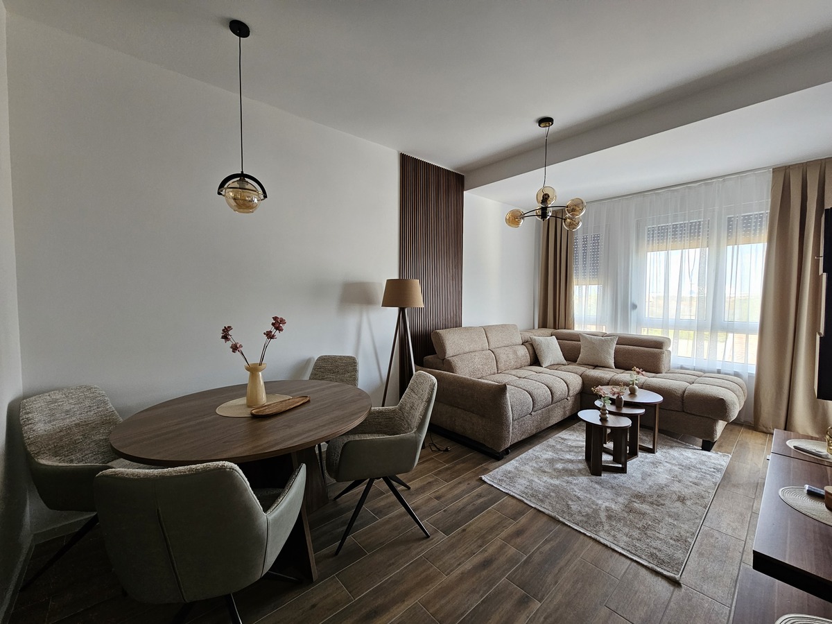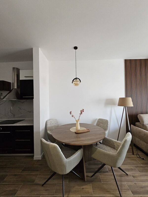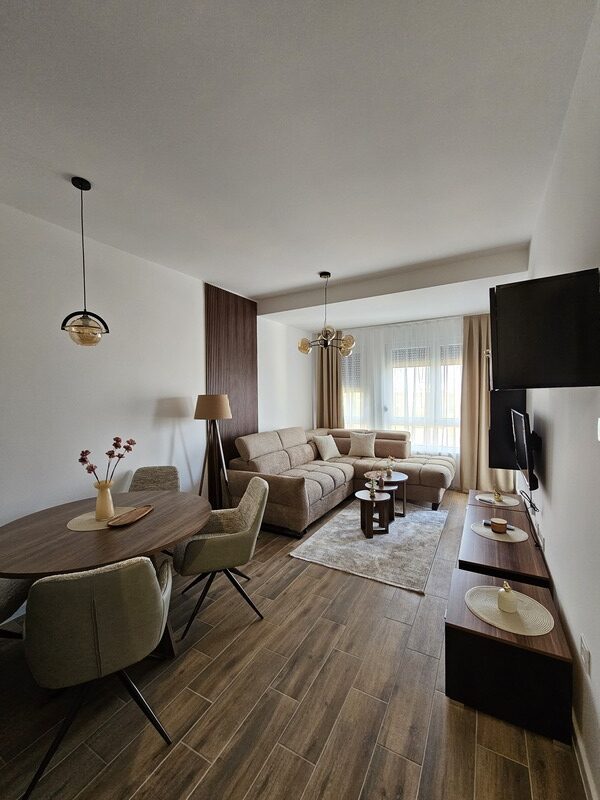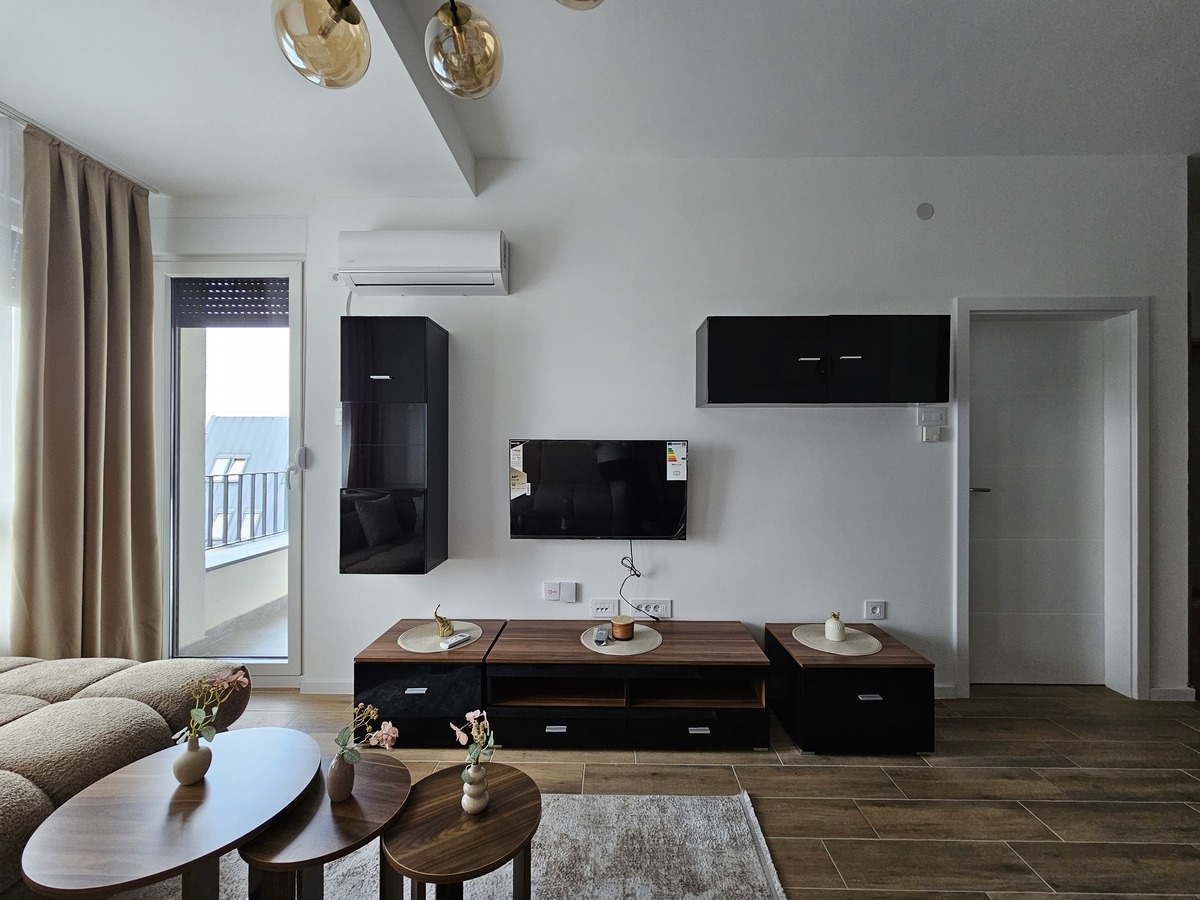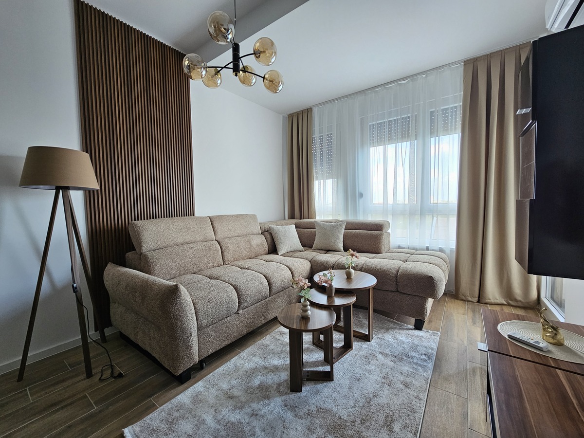 Stan je kompletno namešten, kao na slikama, ugradna kuhinja sa tehnikom, trpezarijski sto sa stolicama, ugaona garnitura klub sto, TV komode i TV