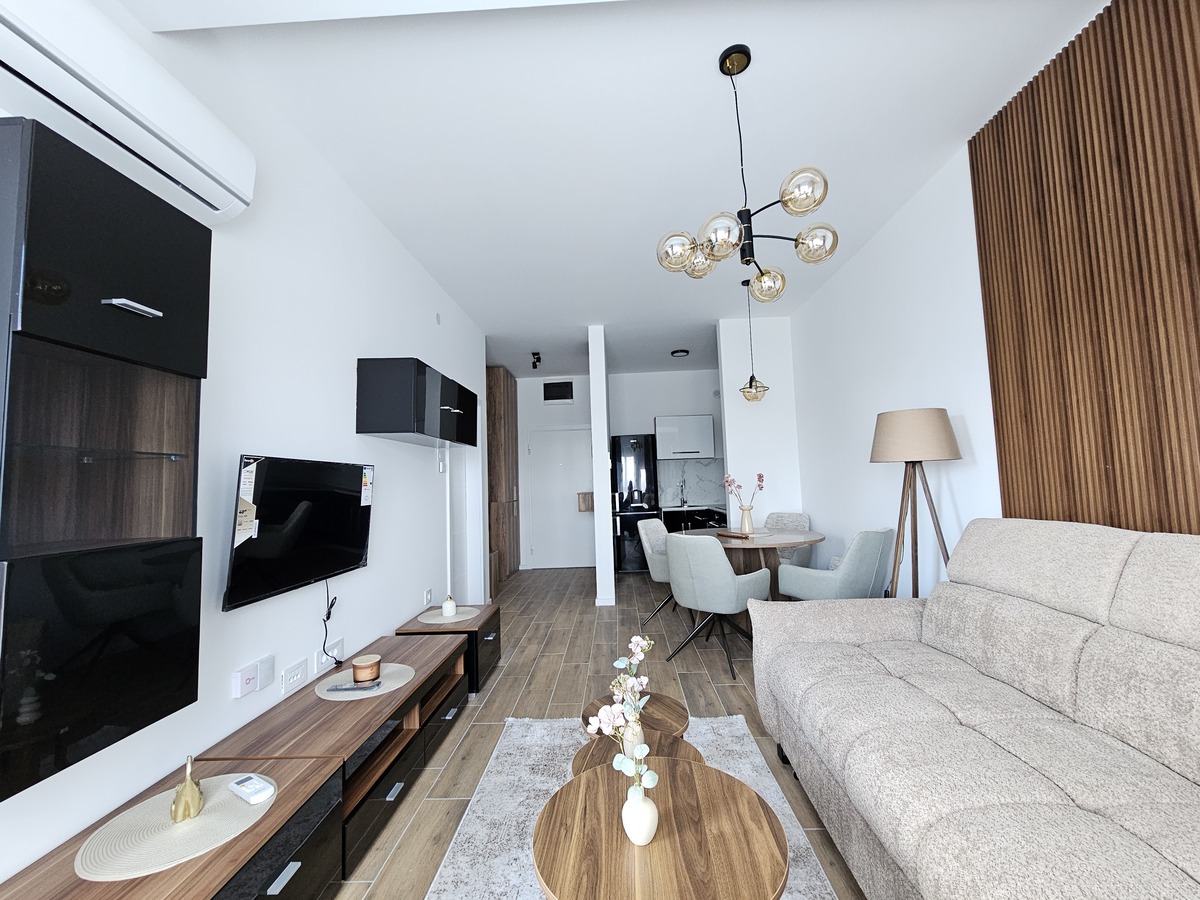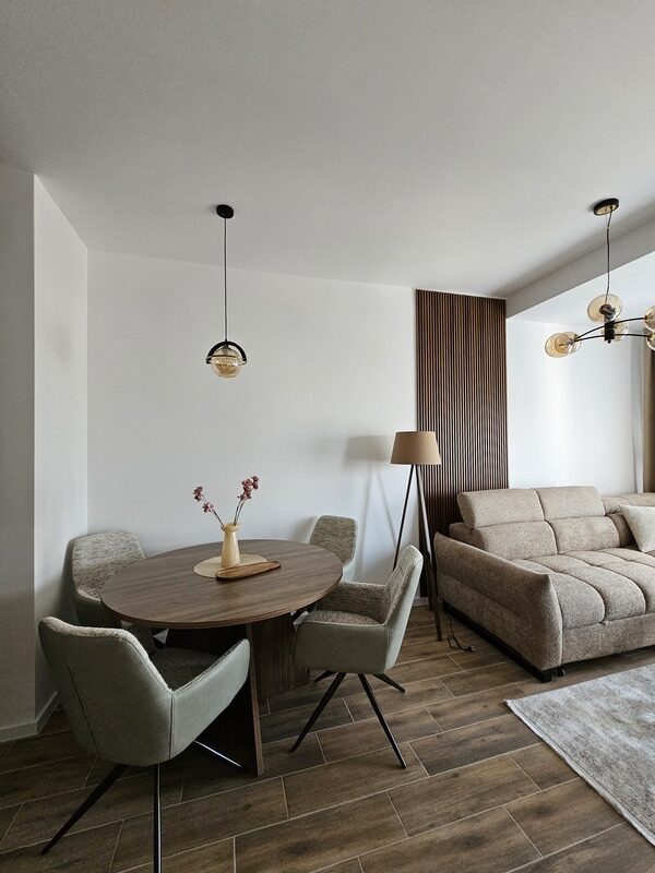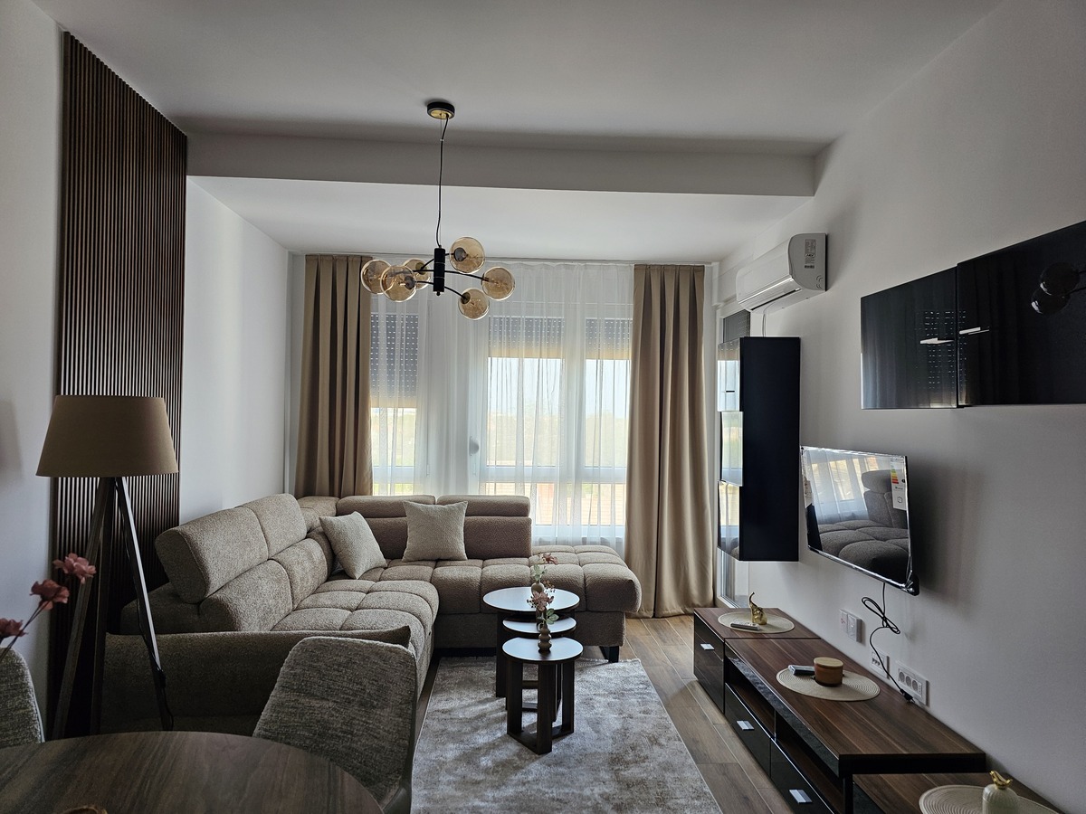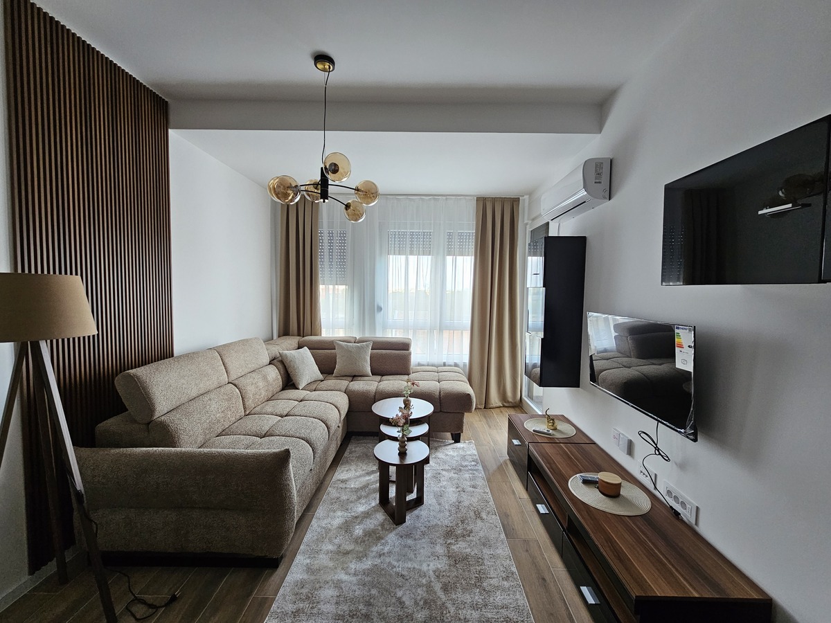 Stan je kompletno namešten, kao na slikama, ugradna kuhinja sa tehnikom, trpezarijski sto sa stolicama, ugaona garnitura klub sto, TV komode i TV