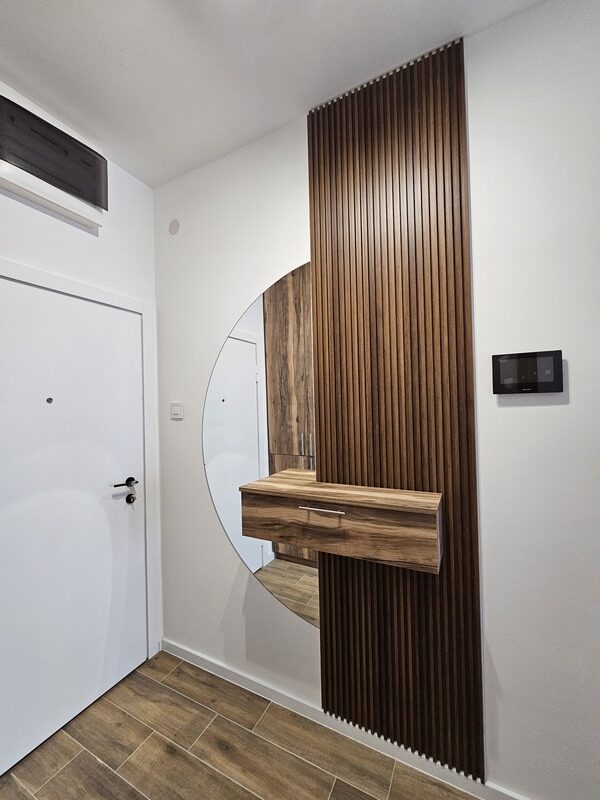 U ulazu je plakar, cipelarnik i ogledalo.Kupatilo je sa tuš-kabinom i veš-mašinom.